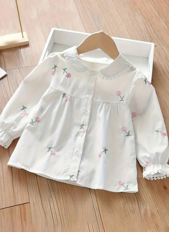 Découvrez nos adorables chemisiers pour petites filles, parfaits pour un look doux et élégant. Le premier modèle est un chemisier blanc orné d'un col à volants délicats avec deux cœurs brodés roses, ajoutant une touche tendre et raffinée. Le second modèle est une blouse légère décorée de petites fleurs brodées, avec des manches bouffantes et des poignets élastiques pour un confort optimal. Idéals pour toutes les occasions — sorties, cérémonies ou simples balades — ces hauts allient style et confort pour votre petite princesse.