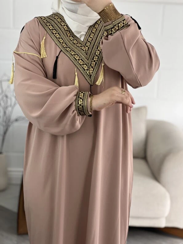 Sublimez votre garde-robe avec cette magnifique djebba rose poudré, ornée de broderies dorées délicates et de jolis pompons pour une touche sophistiquée. Alliant confort et élégance, elle est parfaite pour toutes vos occasions spéciales ou pour un look chic au quotidien.