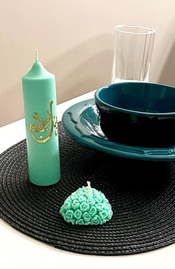 Duo de bougies artisanales turquoise comprenant une bougie longue ornée d’une calligraphie dorée raffinée et une bougie en forme de cœur décorée de délicates roses sculptées. Ces bougies élégantes sont idéales pour des événements spéciaux tels que les mariages, les fiançailles ou les célébrations religieuses. Offrez une touche de douceur et de symbolisme à votre décoration.